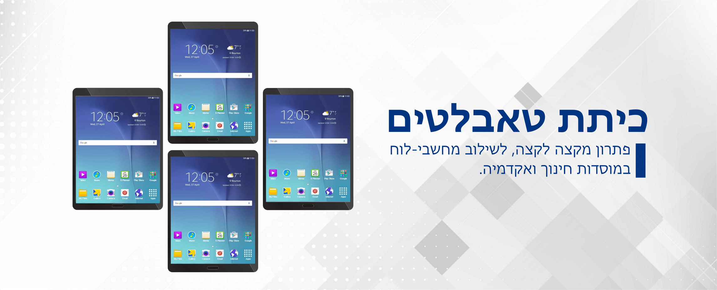 כדי לאפשר שימוש יעיל ואפקטיבי בכיתת טאבלטים, אנו מציעים שירות מקצה לקצה שיספק עבור מוסדות חינוך, לא רק את הטאבלטים האיכותיים ביותר, אלא גם הקשחה והגנה מפני נפילות, עגלת טעינה ואבטחה של הטאבלטים וכן תוכנת שליטה מתקדמת המאפשרת למידה יעילה ונוחה.